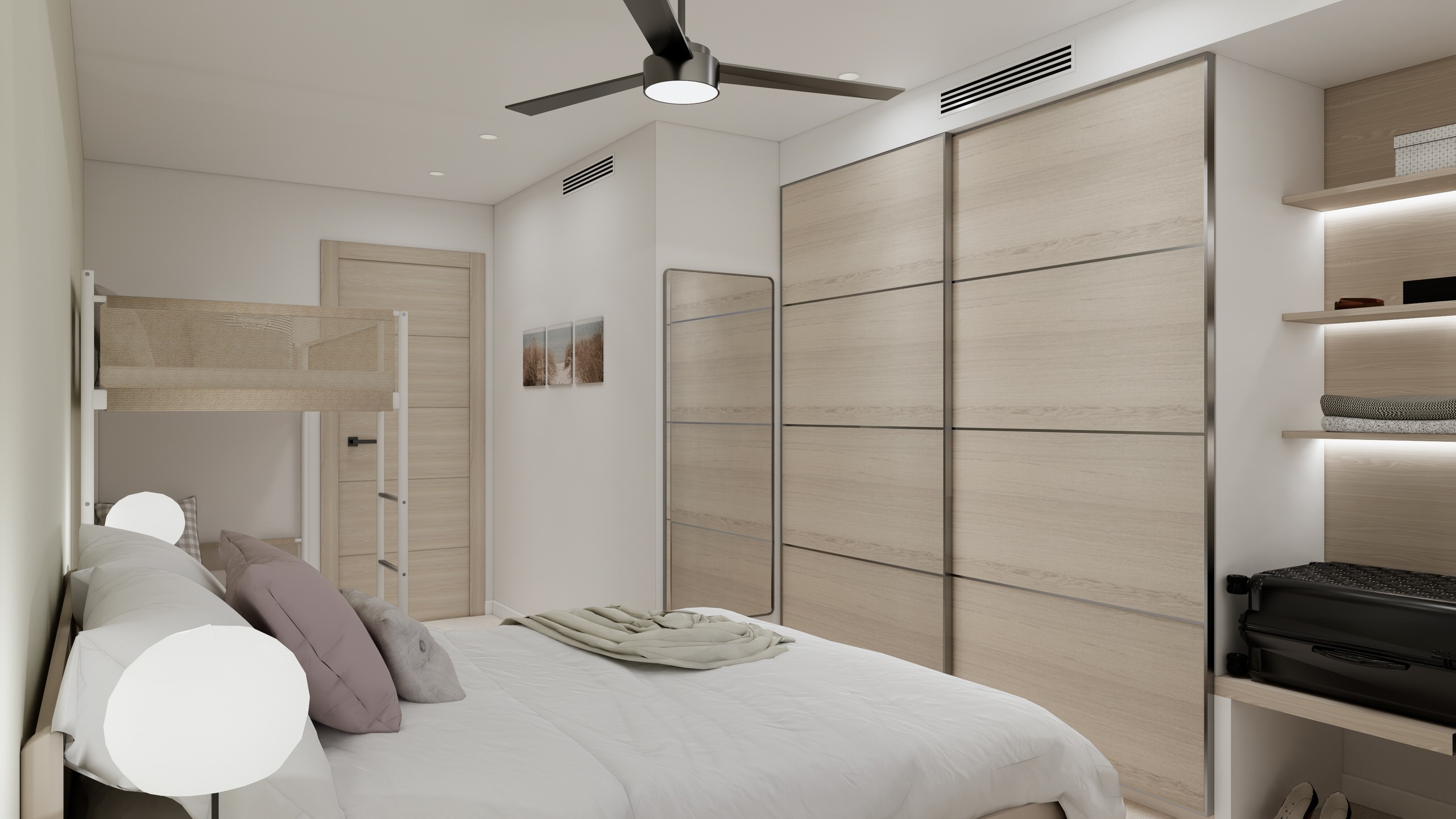 Se buscan dos dormitorios amplios, el principal con amplios armarios y zona de trabajo, y el secundario con cama doble y litera, dos baños completos, una cocina más pequeña justo al salón, y una zona de salón-comedor amplia y luminosa, así como actualizar y modernizar todo el piso.